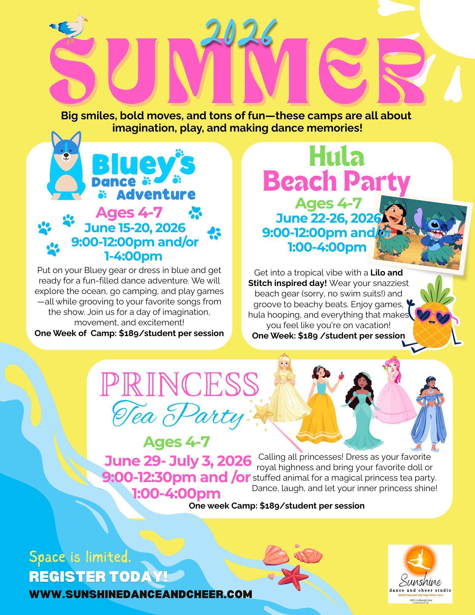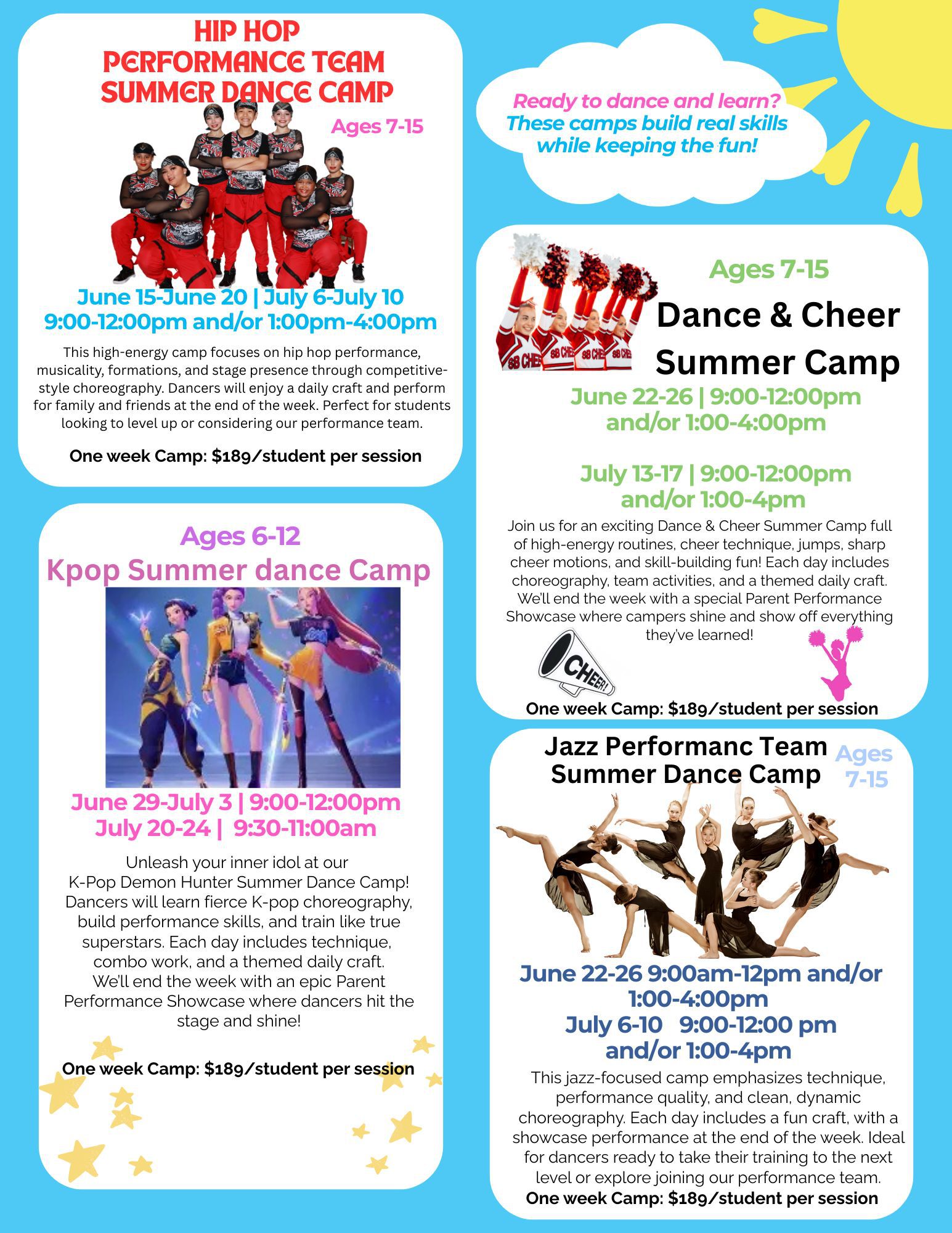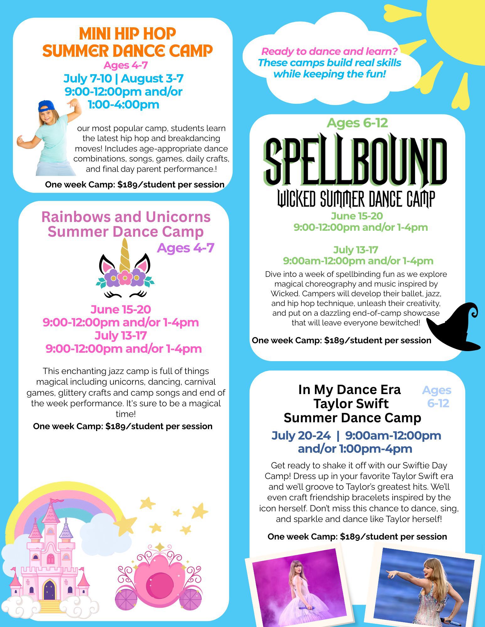 Each Camp is carefully created to engage, stimulate, challenge and encourage your child to be the best dancer and team mate they can! Join us for week long camps over June and July and watch your child's confidence and dance abilities flourish!